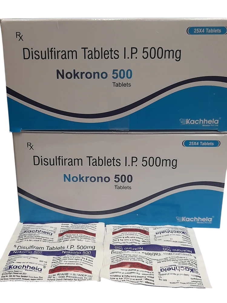 Nokrono 500 mg (Disulfiram) is a prescription medicine used in the treatment of chronic alcoholism. It works by producing unpleasant effects when alcohol is consumed, thereby discouraging drinking.
