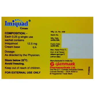 Imiquad Cream Sachet 3×0.25 gm is indicated in the treatment of basal cell carcinoma (a type of skin cancer), actinic keratosis (precancerous growths) and warts on the foreskin of the penis in men and on the vagina in women. Basal cell carcinoma (BCC) is a type of skin cancer where that appears as a slightly transparent bump on the upper layer of skin. Actinic keratosis is a scaly, rough patch on the skin that develops due to excessive sun exposure for many years. A wart is a small, fleshy bump on the skin or mucous membrane. Warts can spread from one body part to another.