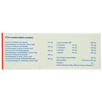 Ketosteril Tablet is used to help manage chronic kidney disease (CKD), especially in patients with impaired kidney function. It contains essential amino acids and their keto analogues, which help reduce the buildup of harmful waste products in the blood while maintaining adequate nutrition.