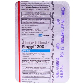 Flagyl 200 Tablet belongs to a group of medicines called Antimicrobials,’ used to treat bacterial infections of the blood, brain, lung, bone, pelvic area, stomach lining, intestines, gum, teeth, following childbirth, or wound infection following an operation. It is also used to treat infected leg ulcers, pressure sores, stomach ulcers caused by Helicobacter pylori, urinary or genital infections caused by the Trichomonas parasite, amoebiasis (parasitic infection of the colon), and to prevent infections after surgery.
