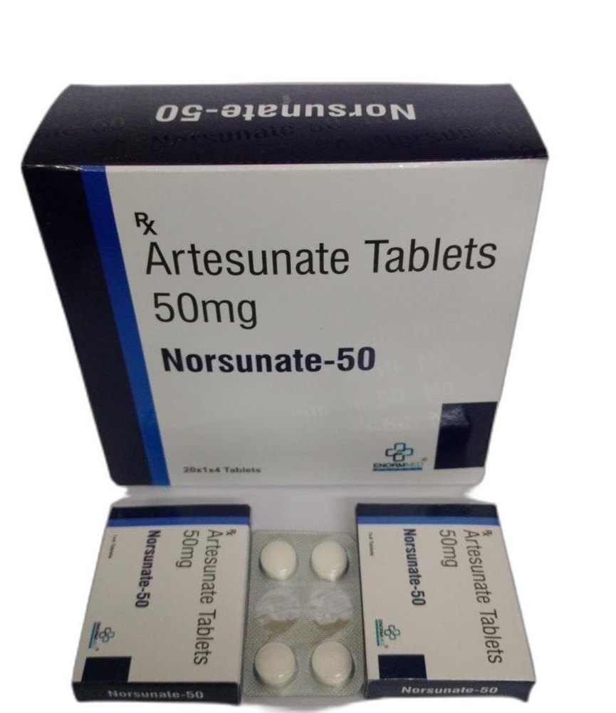 Norsunate 50 mg contains Artesunate, a potent antimalarial agent derived from artemisinin. It is used to treat malaria infections, particularly those caused by drug-resistant strains of Plasmodium falciparum. Artesunate rapidly reduces the parasite load and helps relieve symptoms quickly.
