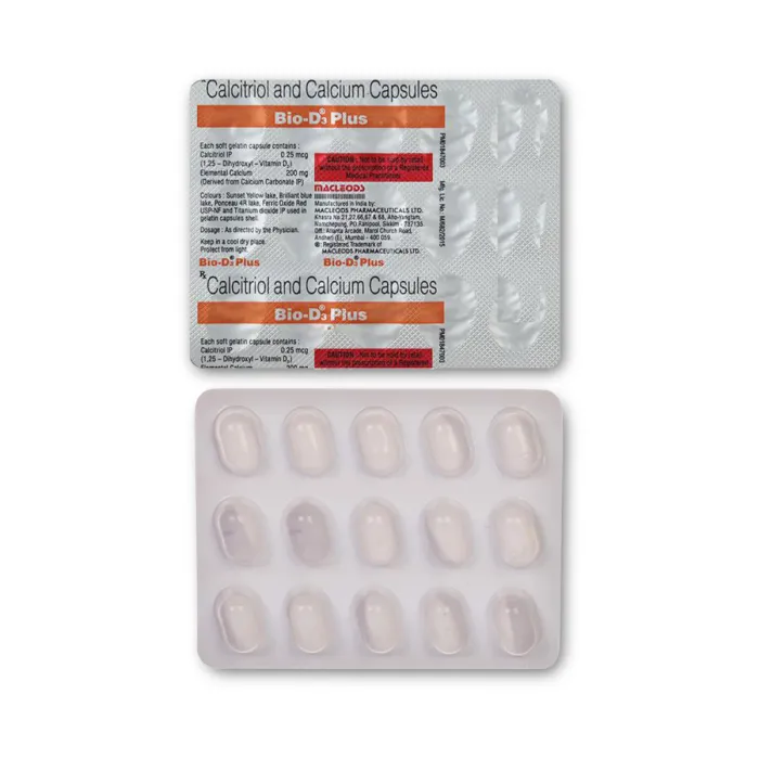 Bio-D3 Plus Calcium & Calcitriol Soft Gelatin Capsule is a nutritional supplement used in the treatment of calcium deficiency. It is prescribed when your diet alone cannot provide the necessary calcium your body needs. It increases the absorption of calcium and helps prevent or treat low blood calcium levels.